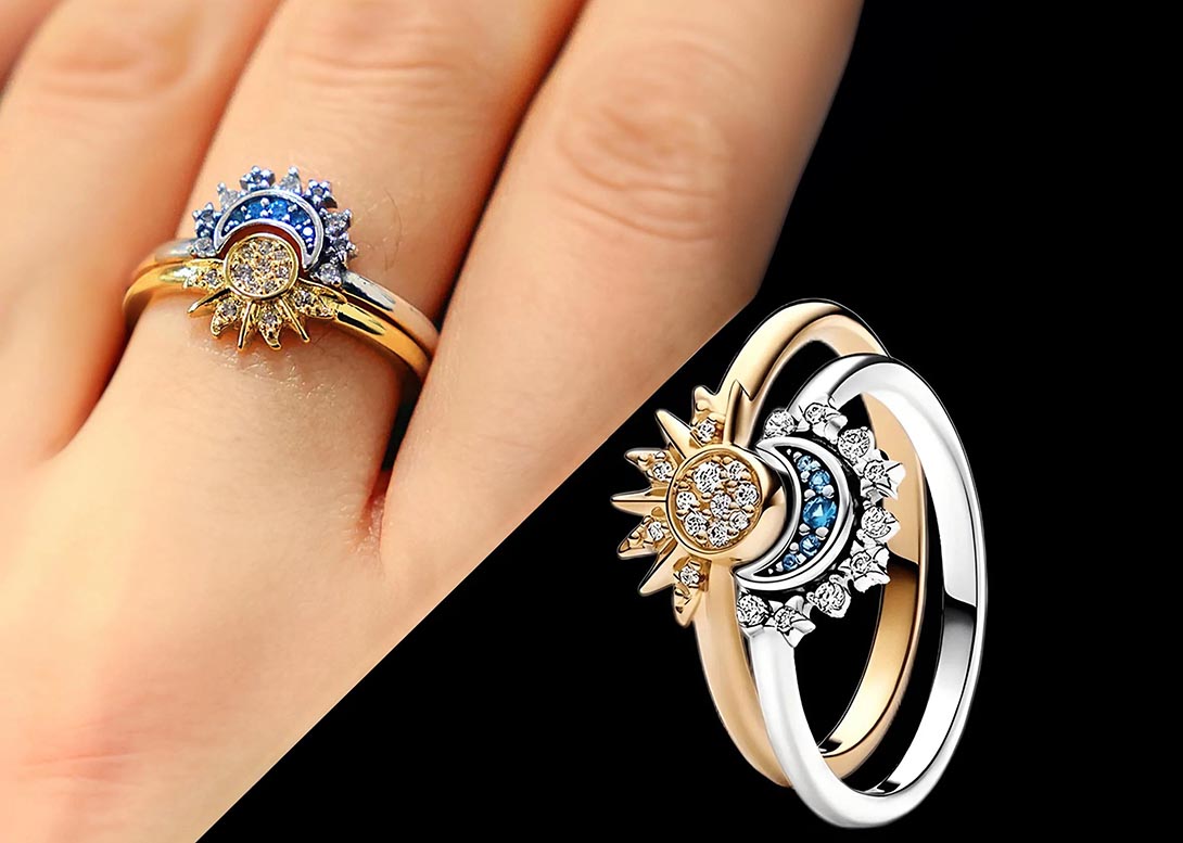 Deze prachtige ringenset bestaat uit twee op elkaar afgestemde ringen: de Pandora Moments Celestial Sun Ring, vervaardigd uit 14-karaats verguld metaal en bezet met een transparante zirkonia, en de Pandora Moments Celestial Ring, gemaakt van massief sterlingzilver met een diepblauw kristal en transparante zirkonia. Samen belichamen ze de balans van zon en maan, licht en schaduw — een visuele ode aan het ritme van de natuur.
